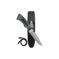 Lame en acier spĂ©cial inoxydable trempĂ©, avec un fil lisse d’un cĂ´tĂ© & partiellement crantĂ© en scie de l’autre. Celui-ci se termine prĂ©s du manche par une Ă©chancrure coupe filets ou lignes de pĂŞche.